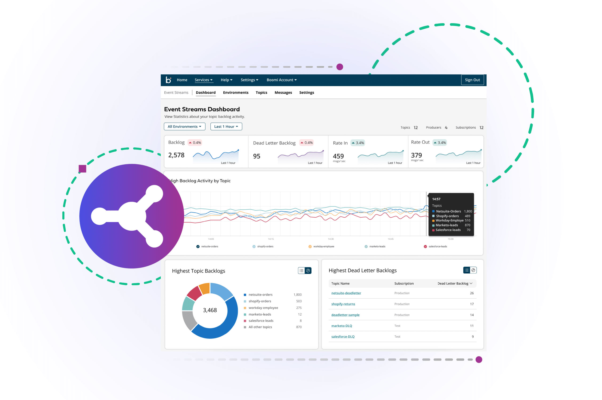 Monitor all Boomi event-driven integrations in one view for easy management.