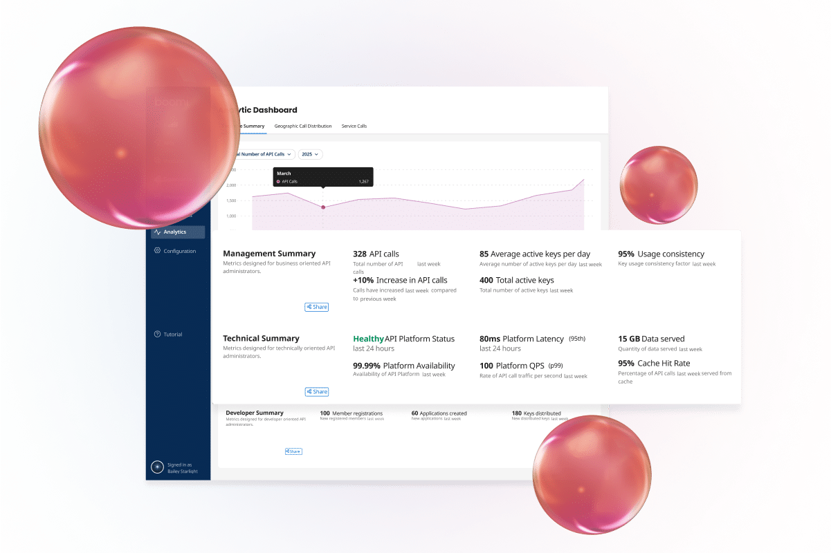 APIの状態やパフォーマンス、稼働状況、利用傾向をリアルタイムで可視化。APIの最適化や迅速な意思決定、ビジネスとの連携強化を後押しします。